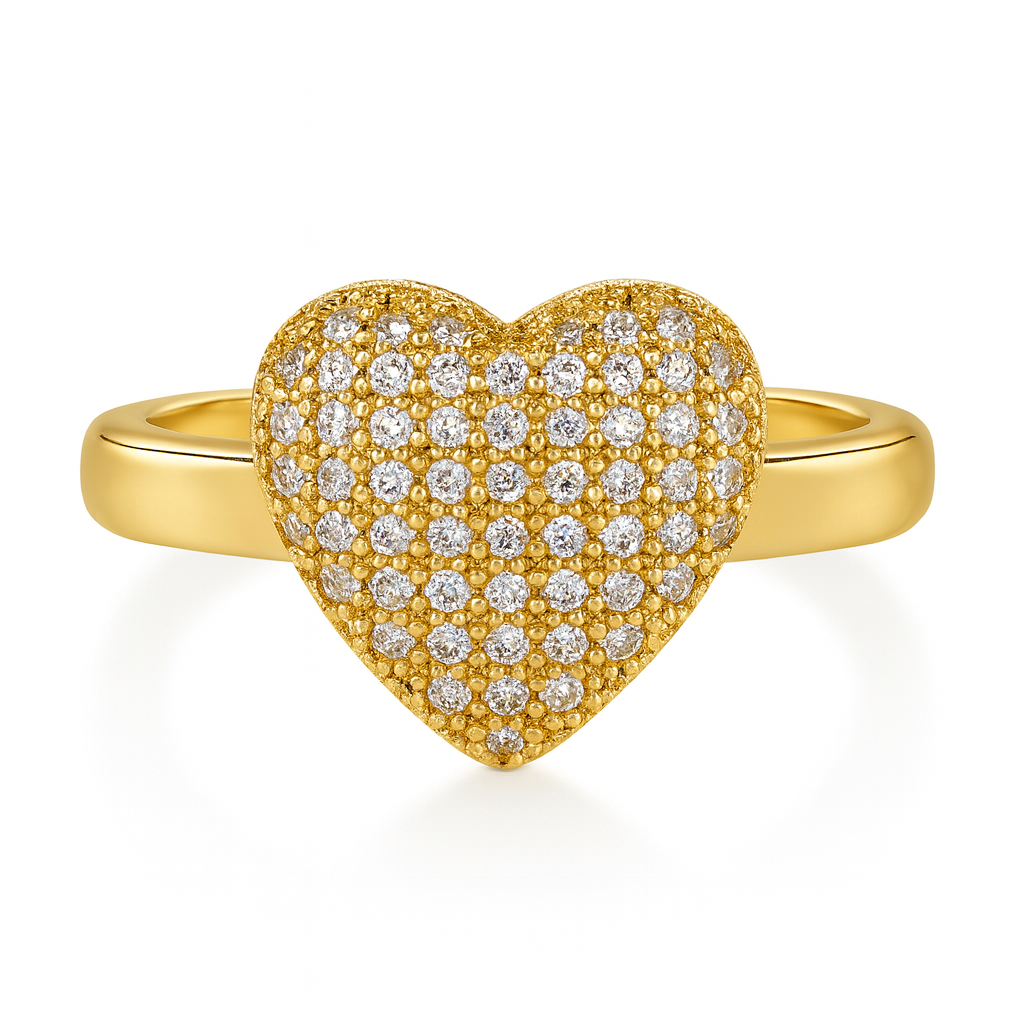 Anel coração cravejado em microzircônia cristal banhado a ouro 18k dourado coração com 1,2 cm de espessura