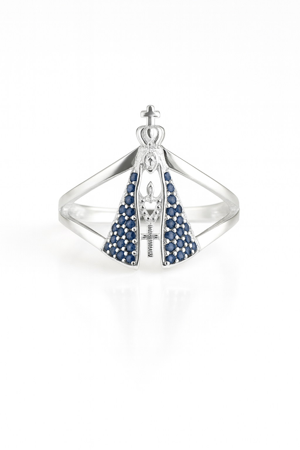 Anel Nossa Senhora Aparecida zircônia azul Safira prata 925